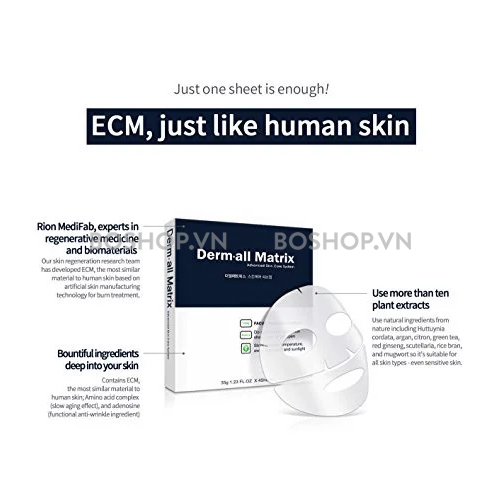 Mặt Nạ Derm All Matrix Facial Dermal Care Mask là mặt nạ giấy thuộc thương hiệu Derm All Matrix được nghiên cứu và điều chế dựa trên các thành tựu về khoa học và sinh học, chứa các chiết xuất thực vật và nguyên liệu ECM đã được diệt khuẩn và kiểm chứng – chất liệu tương tự như da người, được sử dụng trong điều trị bỏng, tái tạo da. Mặt nạ giúp chăm sóc và nuôi dưỡng làn da một cách toàn diện giúp dưỡng trắng, cải thiện nếp nhăn, bổ sung độ ẩm cũng như cải thiện kết cấu da.